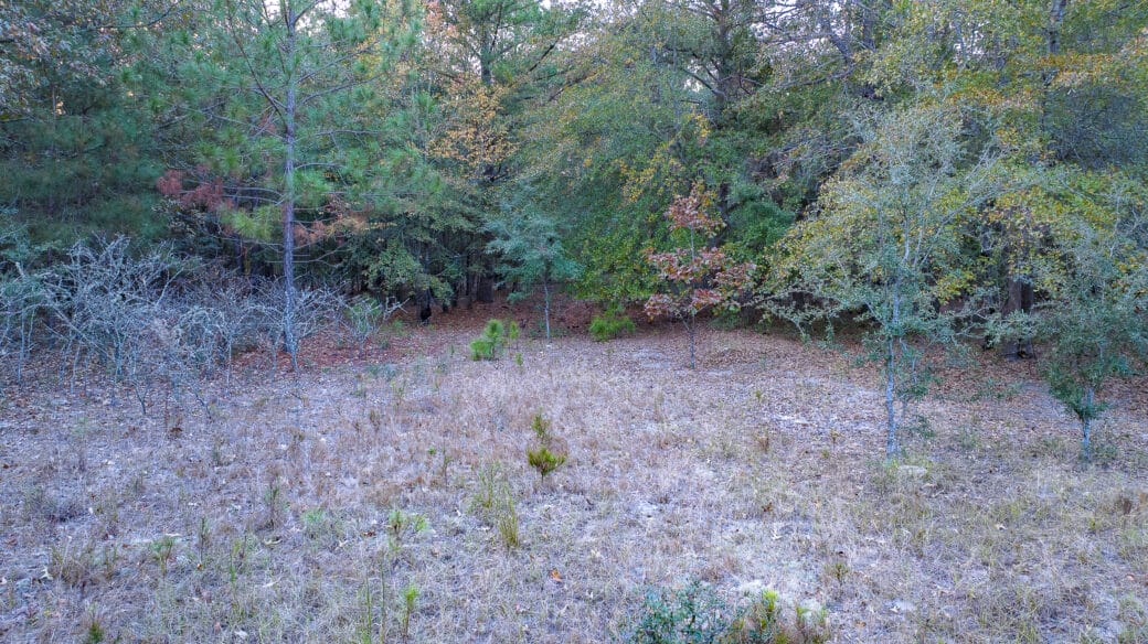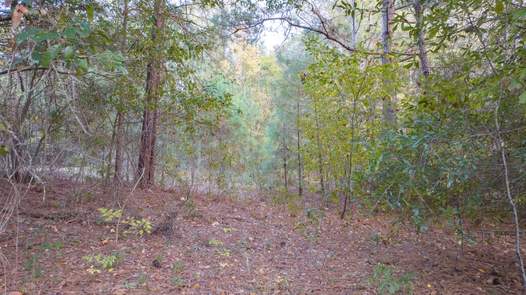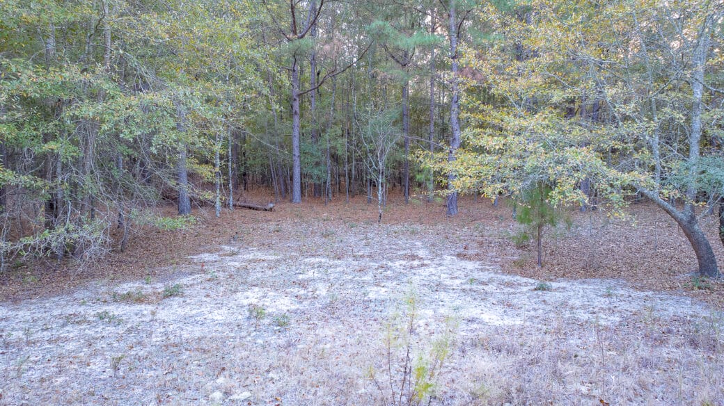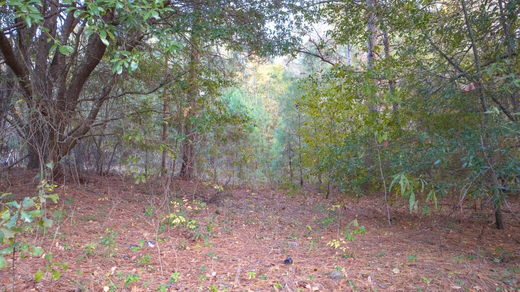 It’s mostly flat with mature pine and hardwood trees, with pine straw and leaf cover across the ground. You’ll need to clear a small area to start building, and the wood you remove can be saved for campfires later on.