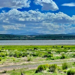 Looking west, there’s a clear view of South Fork Reservoir. You can see the water, grassy shoreline, and rolling hills beyond. It’s not a far-off glimpse. The lake is close and visible from ground level.