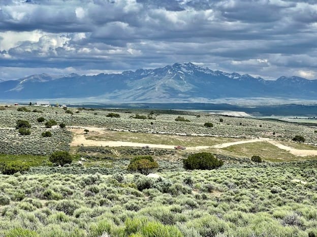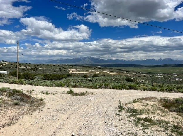 Looking east and southeast, you’ll see the Ruby Mountains stretching across the horizon, still dusted with snow even in warmer months. The view is wide and unblocked, with no buildings or power poles in the way.