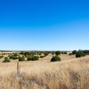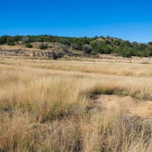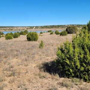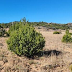 Terrain of the property has a slight slope, higher on the south side and gradually sloping north, but it’s mostly flat overall, with small juniper trees, natural grasses, soft dirt, and scattered shrubs.
