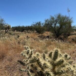 Mostly level with a gentle slope in some areas. The soil is sandy with a little gravel and plenty of native desert plants like mesquite, cholla, prickly pear, yucca, and patches of desert grass. Some parts have thicker shrubs and small wash-like dips, which is normal for this part of the Sonoran Desert.