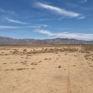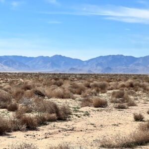 Terrain is mostly flat with a gentle wash running through part of the property. The ground is classic Mohave Desert: hard-packed sandy soil with scattered shrubs, desert grasses, and low brush. You’ll see creosote, sagebrush, and tumbleweed patches, plus the usual desert wildlife like rabbits, birds, lizards wandering through.