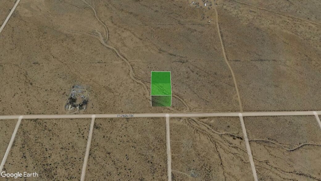Terrain is mostly flat with a gentle wash running through part of the property. The ground is classic Mohave Desert: hard-packed sandy soil with scattered shrubs, desert grasses, and low brush. You’ll see creosote, sagebrush, and tumbleweed patches, plus the usual desert wildlife like rabbits, birds, lizards wandering through.