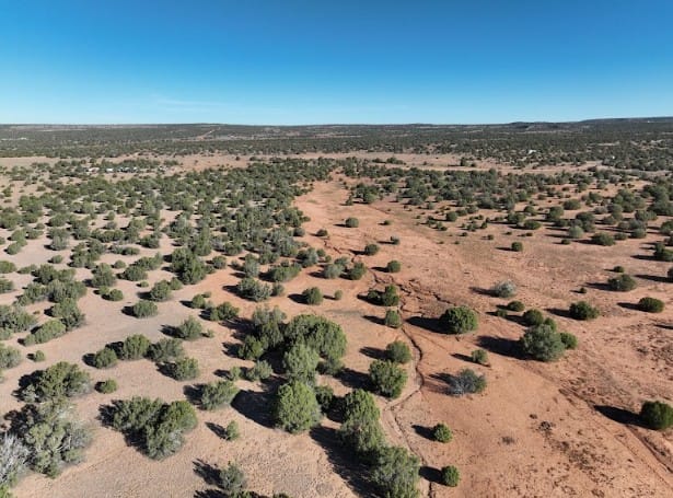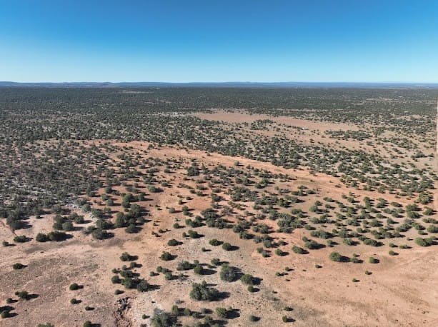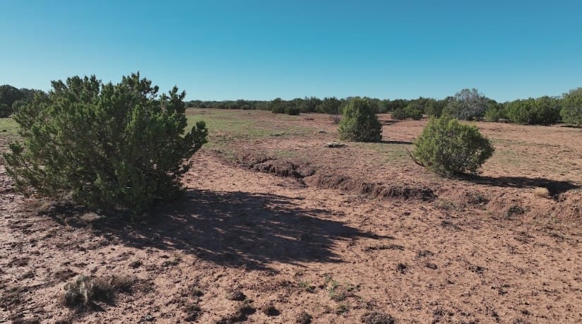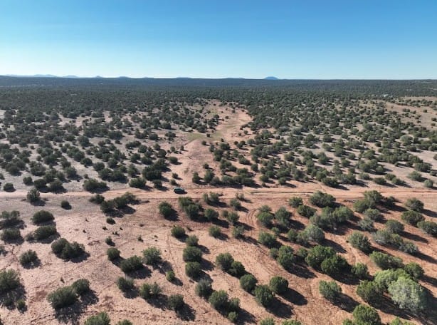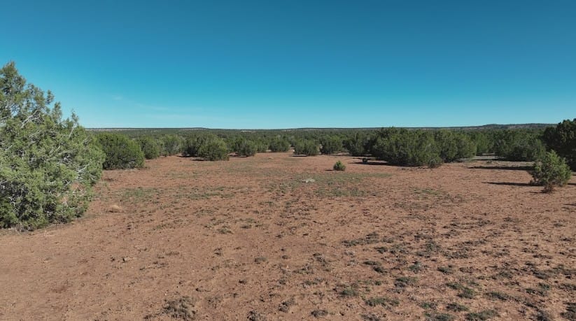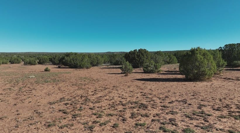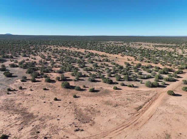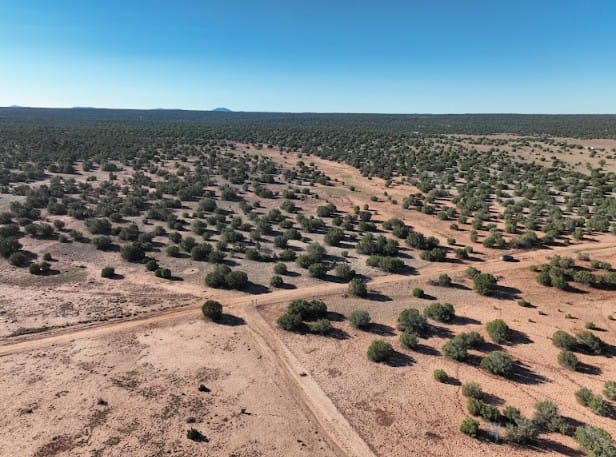 20+ acres in 9445 Texas Ln, Show Low, AZ, 85901 of mostly flat terrain with firm soil and a few sandy patches. Junipers are scattered across the land, with some spots more clustered and others opening into clear, usable areas, especially through the center where a cabin or campsite would fit well. Up close it feels calm and untouched. You’ll notice some old vehicle tracks in a few areas, but the land itself is clean, quiet, and free of debris.