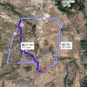 Alamosa is roughly 50 minutes away, offering full grocery stores, medical care, restaurants, and shopping centers.