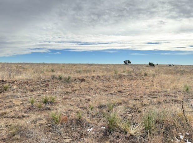 5.07-acre corner lot parcel sits on mostly flat to gently rolling high-desert ground in northeastern New Mexico. The soil feels firm and compact with a mix of sandy earth and small rocks, which is typical for this area. The land is easy to walk and navigate, with no steep slopes or difficult terrain.